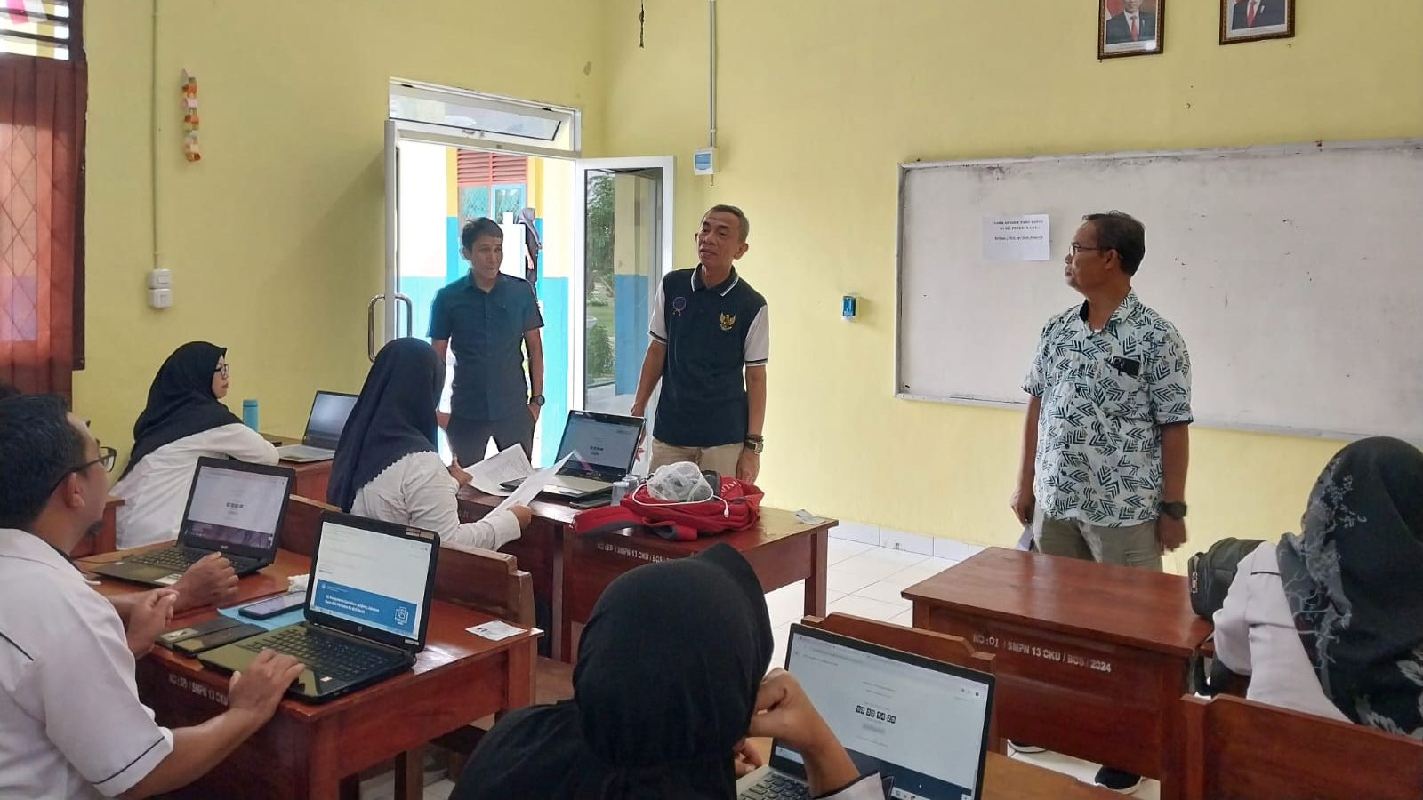 Drs. H. Topan Indra Fauzi MM M.Pd Kadisdik OKU, yang didampingi Taufiq Hidayat S.KOm MM, Kabid Pembinaan Ketenagaan, usai memantau UKKJ di SMPN 13 OKU.