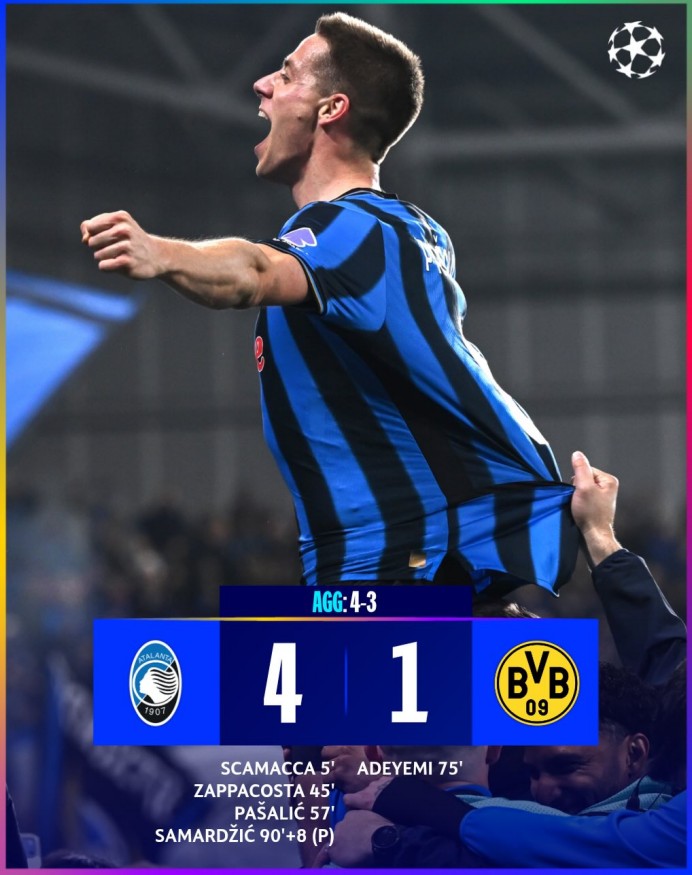 COMEBACK IS REAL! : Sempat tertinggal agregat 0-2, Atalanta ngamuk di Bergamo dan gilas Dortmund 4-1! Dramatis sampai menit akhir, La Dea resmi melangkah ke babak 16 besar UCL dengan agregat 4-3. Mentalitas baja!