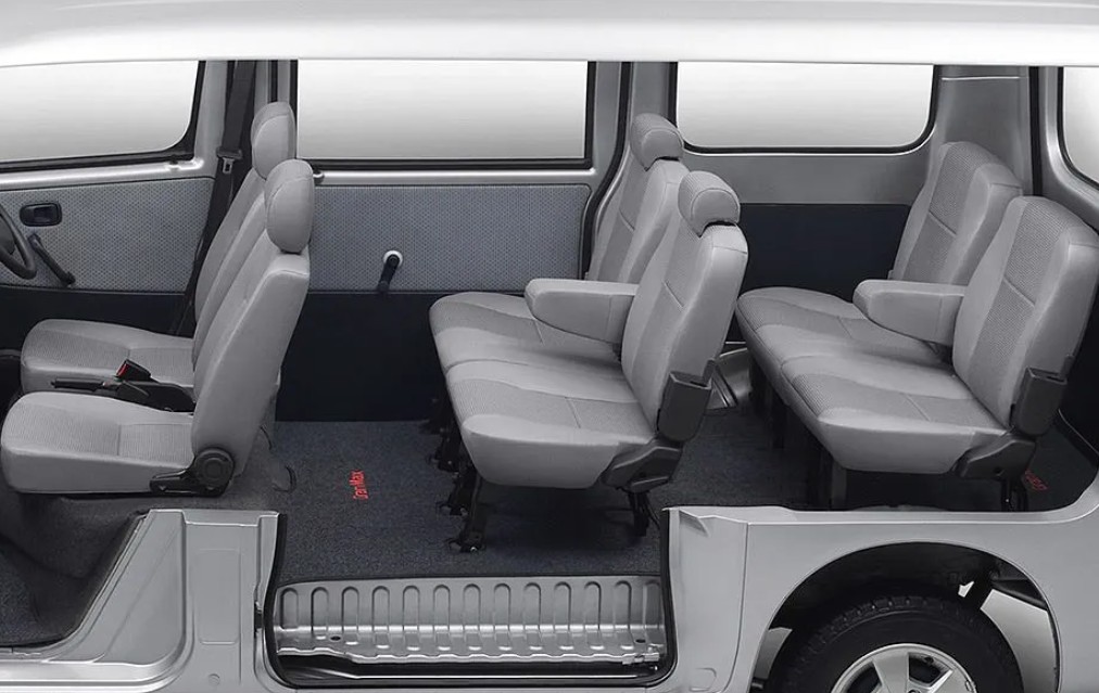 NYAMAN : Tampilan ruang kabin Daihatsu Gran Max Minibus 2026 yang luas dan fungsional. Konfigurasi kursi dirancang senyaman mungkin untuk perjalanan jarak jauh. Selain itu, pintu geser samping memberikan kemudahan akses keluar masuk bagi para penumpang travel.