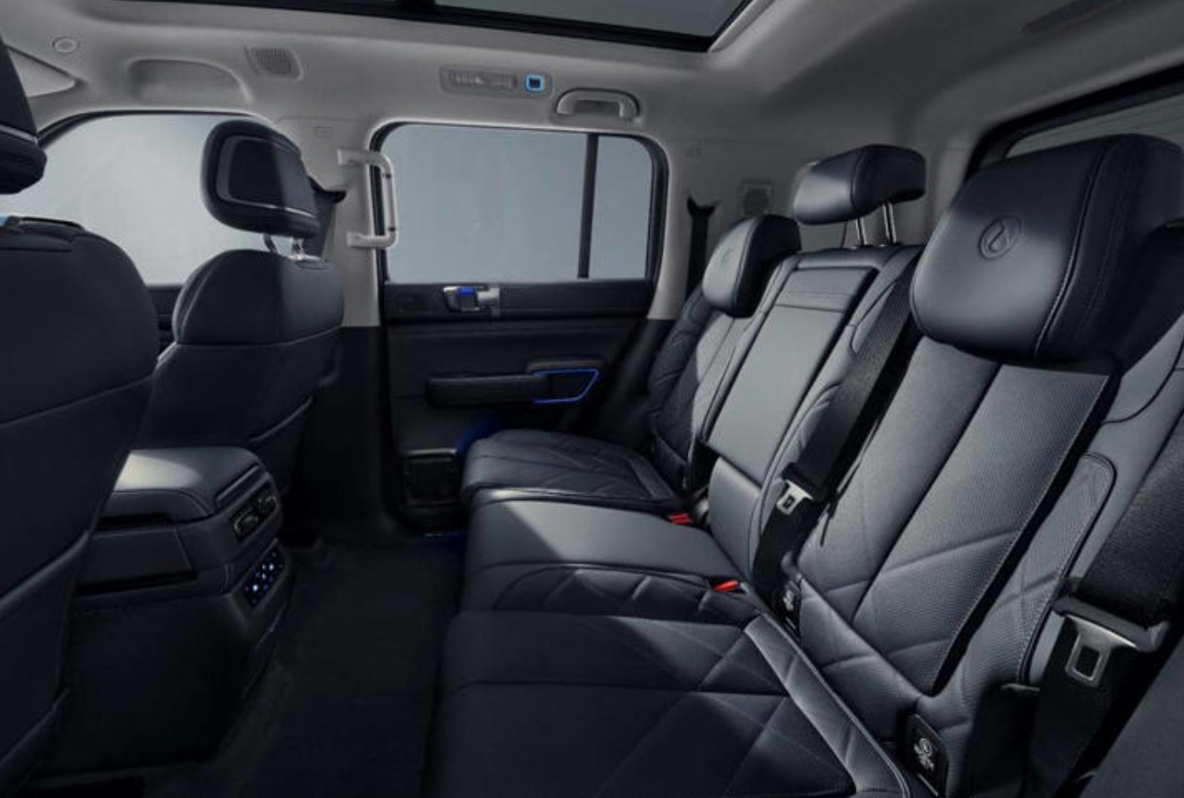Kenyamanan paripurna di baris kedua. Balutan kulit nappa premium dan ruang kaki yang lega menciptakan suasana rileks bagi penumpang, menegaskan identitas Denza B5 sebagai SUV kelas atas.