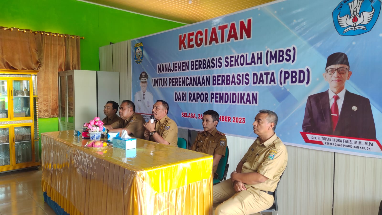 PBD 1 : Kepala Dinas Pendidikan Kabupaten OKU, Drs H Topan Indra Fauzi MM MPd memberikan arahan dalam Kegiatan MBS untuk perencanaan Berbasis Data (PBD) dari Rapor Pendidikan.