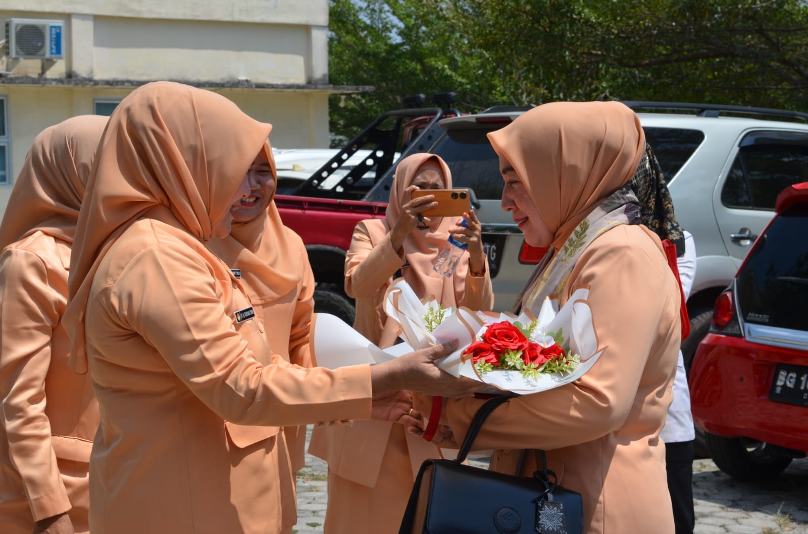 Pengalungan selempang dari Ketua DWP Disdik OKU, Rosdiana Topan Indra F kepada Ketua DWP OKU, Wahidah Darmawan.