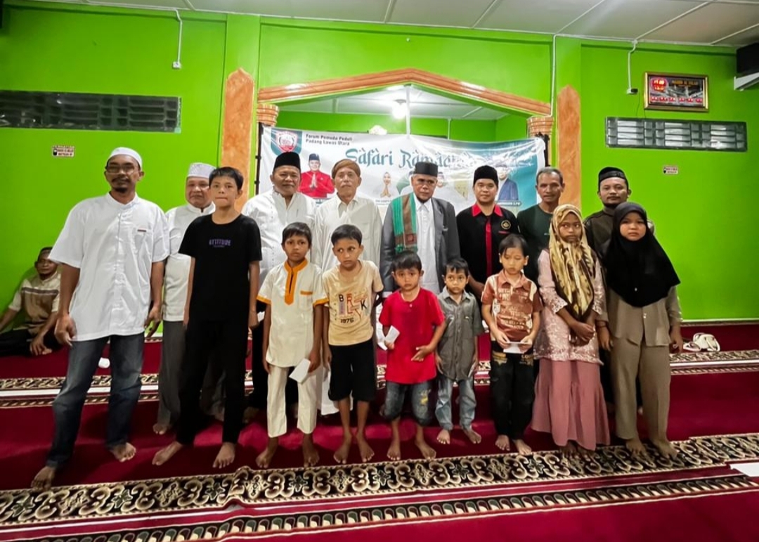 Jajaran pengurus Forum Pemuda Peduli Padang Lawas Utara (FPP Paluta), para tokoh masyarakat, dan anak-anak penerima santunan berpoto bersama setelah kegiatan Safari Ramadhan di Masjid Al Falah, Rokan Baru, Sabtu (7/3/2026).