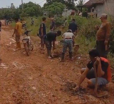 Warga bahu membahu memperbaiki jalan poros Dusun V, Talang Jipang, Desa Kedaton Timur.