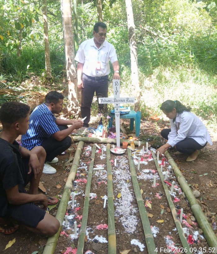 PUSARA TERAKHIR YBS : Suasana haru menyelimuti makam Yohanes Bastian Raja (YBS) di Kabupaten Ngada, NTT, Rabu (4/2/2026). Di balik gundukan tanah dan pagar bambu sederhana inilah, bocah 10 tahun itu kini beristirahat tenang. Kepergiannya meninggalkan duka mendalam dan pesan sunyi tentang rapuhnya hati seorang anak yang merindukan kasih sayang.
