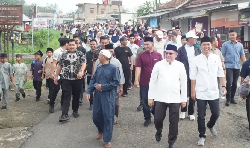 PAWAI TARHIB RAMADHAN : Wakil Bupati OKU, H. Marjito Bachri, berjalan bersama ribuan santri dan warga dalam Pawai Tarhib Ramadhan di Lubuk Raja. Antusiasme masyarakat yang melimpah menunjukkan sukacita besar menyambut bulan suci penuh berkah.