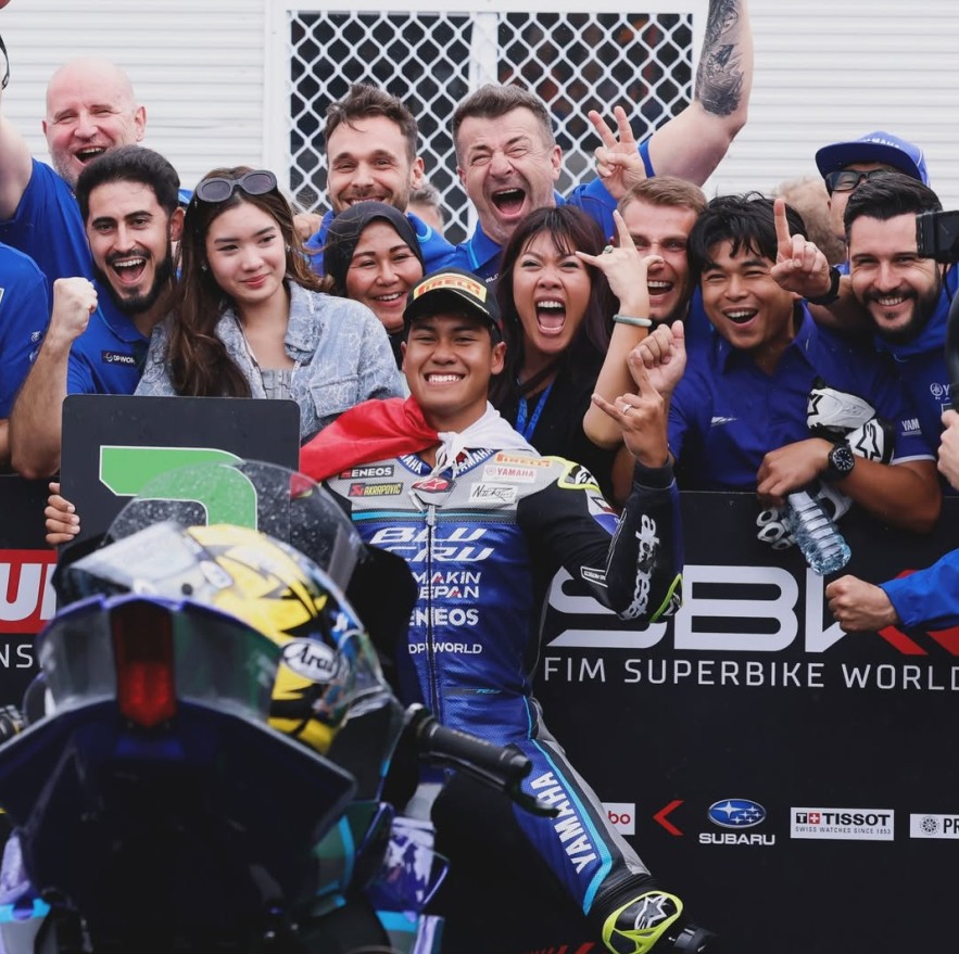 MERAYAKAN KEMENANGAN : Pembalap Indonesia, Aldi Satya Mahendra, merayakan kemenangannya bersama tim AS bLU CRU. Ia sukses mengamankan podium kedua World Supersport 2026. Momen emosional ini terjadi di Sirkuit Phillip Island, Australia, Minggu (22/2/2026). Aldi tampak bangga mengalungkan bendera Merah Putih.