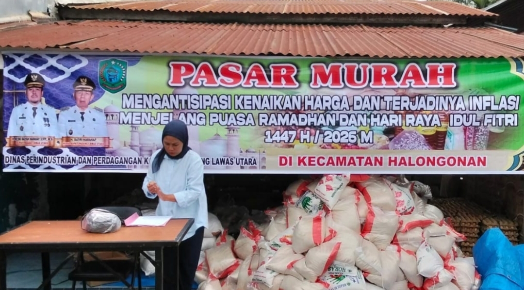 Petugas bersiap melayani warga pada acara Pasar Murah di Kecamatan Halongonan, Kabupaten Padang Lawas Utara, Senin (2/3/2026).