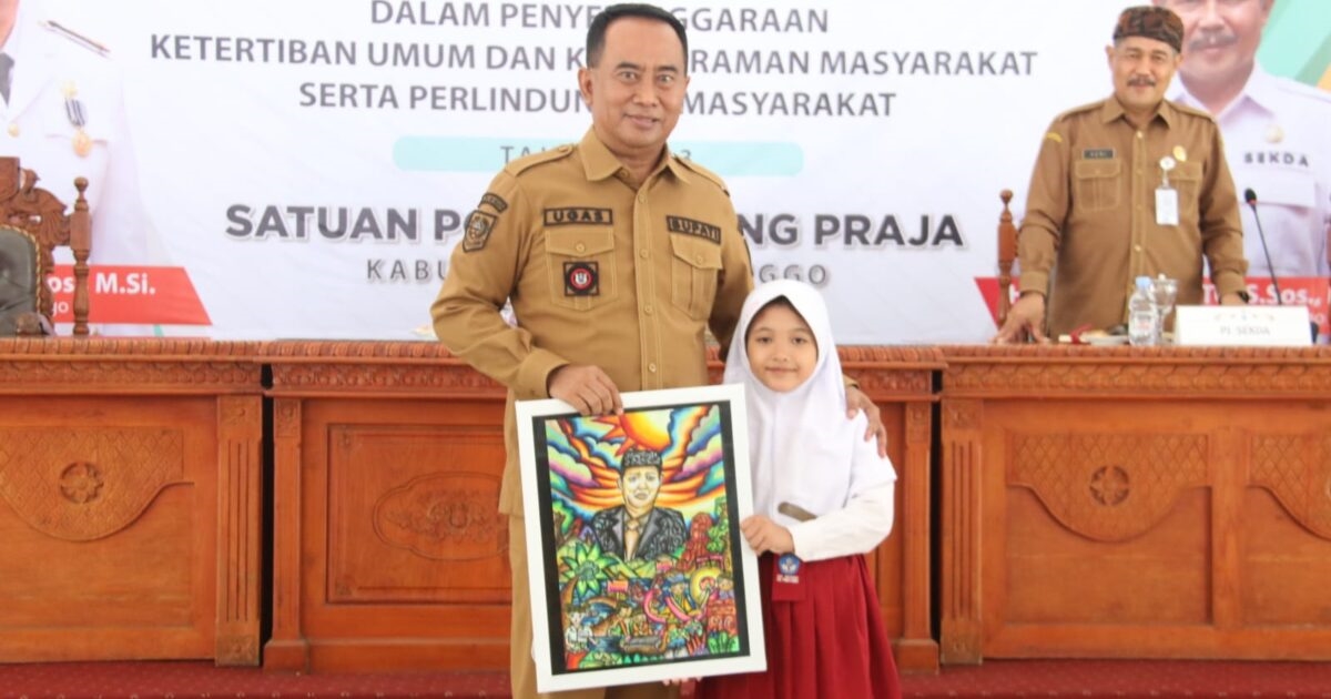 Pj Bupati Probolinggo, Ugas Irwanto SSos MSi menerima lukisan dirinya yang dilukis Nabila Putri Maharani, siswi kelas 1 SD Negeri Sebaung 1, Kecamatan Gending, Kabupaten Probolinggo.