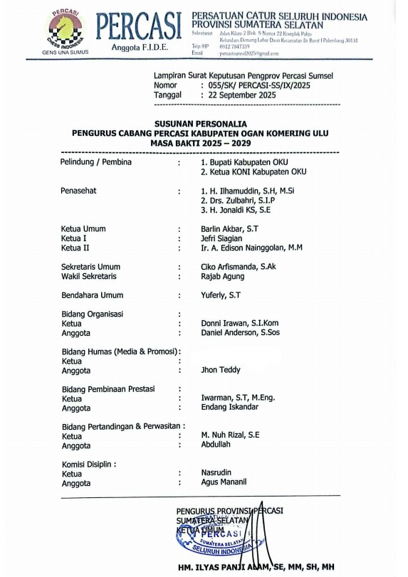 SK Rekomendasi KONI Kabupaten OKU nomor 100/99/KN-OKU/IX/2025 tertanggal 18 September 2025 yang ditandatangani Plt Ketua Umum KONI OKU, H Paranto ditujukan ke Ketua Umum Pengda Percasi Sumsel dengan merujuk surat permohonan Percasi Kabupaten OKU nomor 01/PERCASI-OKU/IX/2025 tentang Permohonan rekomendasi SK Kepengurusan Percasi Kabupaten OKU.