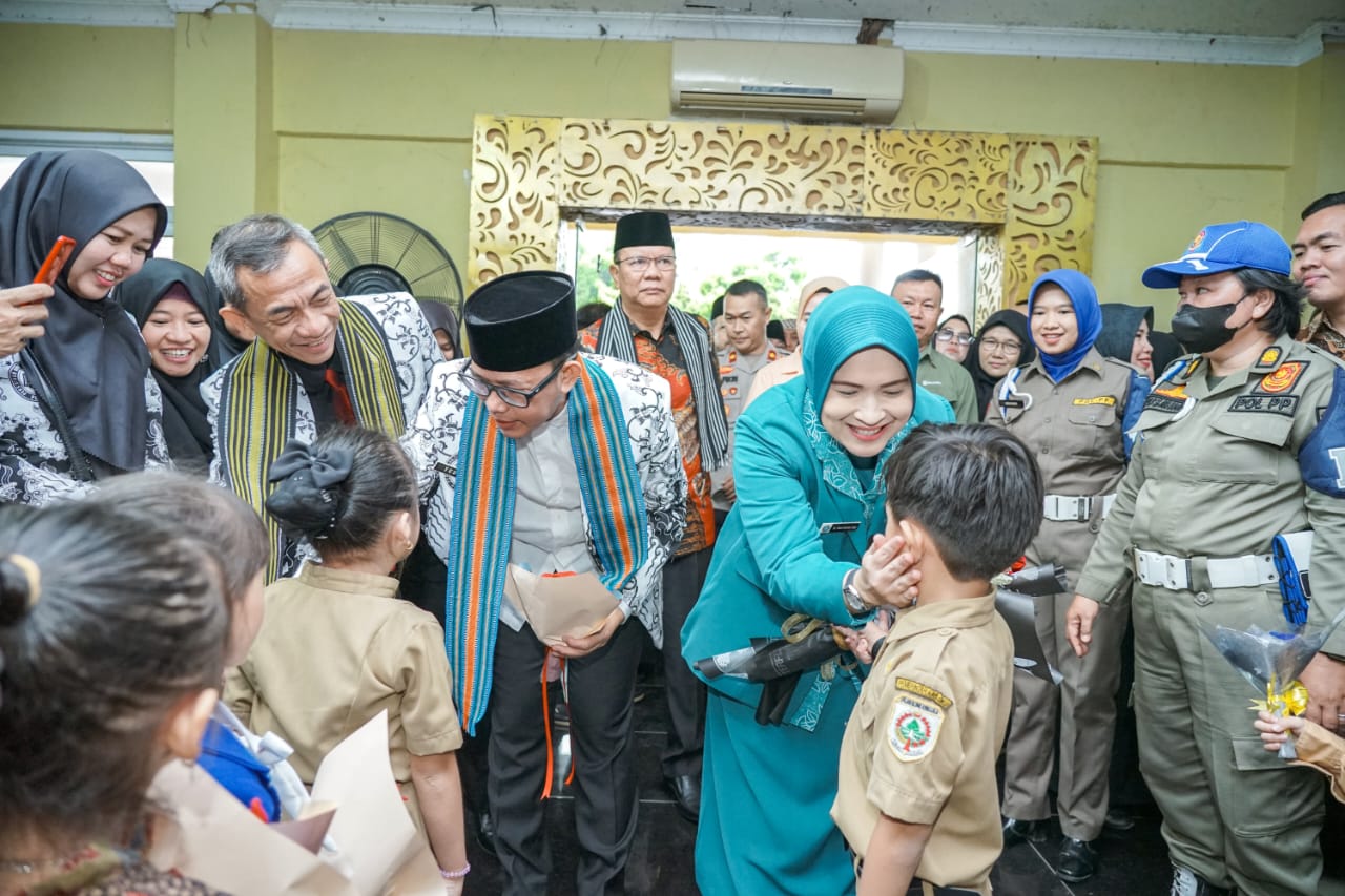 Pj Bupati OKU, H Teddy Meilwansyah SSTP MM MPd bersama Bunda PAUD OKU, Hj Zwesti Karenia Teddy didamping Kepala Dinas Pendidikan OKU, Drs H Topan Indra Fauzi MM MPd menghadiri HUT PGRI ke 78 dan HGN 2023 di Gedung Kesenian Baturaja, Sabtu (25/11/2023).