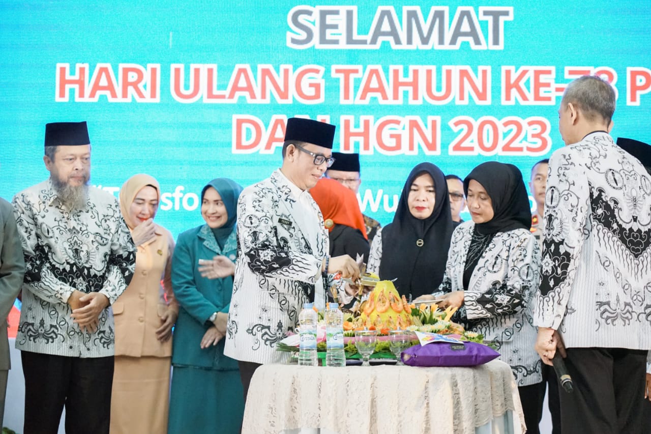 Pj Bupati OKU, H Teddy Meilwansyah SSTP MM MPd melakukan pemotongan tumpeng HUT PGRI ke – 78 dan Hari Guru Nasional 2023 yang dipusatkan di Gedung Kesenian Baturaja, Sabtu 25/11/2023).