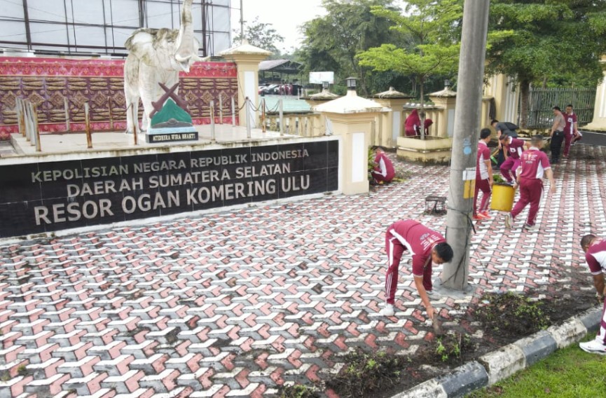 LINGKUNGAN BERSIH dan PELAYANAN PRIMA: Sejumlah anggota Polres OKU menyisir sampah dan merapikan taman dalam kegiatan kurve massal. Melalui lingkungan kerja yang sehat, Polres OKU berkomitmen meningkatkan kualitas pelayanan publik sesuai arahan Presiden RI.