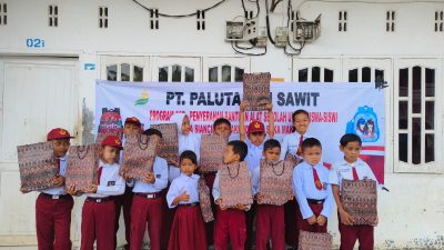 Kepala Tata Usaha PT. PIS Ali Tapi Umar menyerahkan secara simbolis CSR bantuan alat tulis siswa/i SD kepada Kepala Desa Parambangan/Bakkudu Simpang Ternak, Irman Siregar.
