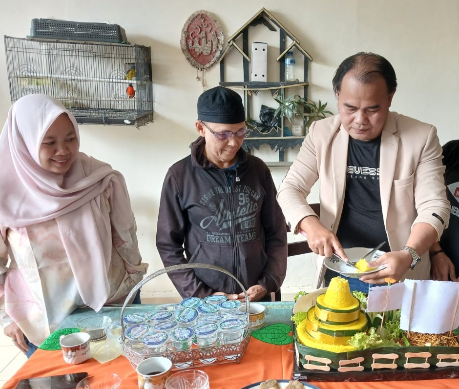 Ketua PWI OKU, Yudi Saputra, memotong tumpeng sebagai simbol rasa syukur. Ia menyerahkan potongan pertama kepada Armin Pani, sosok paling senior dari majalah Gradasi.