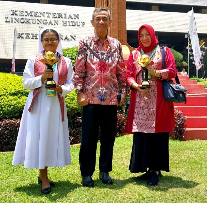 Kepala Dinas Pendidikan Kabupaten OKU, Drs H Topan Indra Fauzi MM MPd bersama dengan Kepala SD Fransiskus Baturaja dan Kepala SD Negeri 11 Kabupaten OKU saat mengambil Piala Adiwiyata Mandiri.
