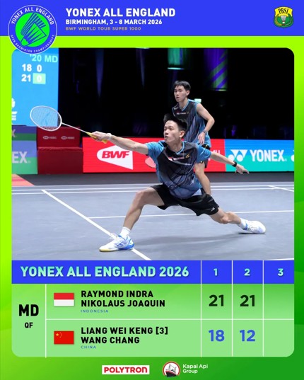 TRANSPARANN.ID – Wakil Indonesia berguguran pada babak perempat final All England Open 2026. Hanya pasangan Raymond Indra/Nikolaus Joaquin yang berhasil lolos.