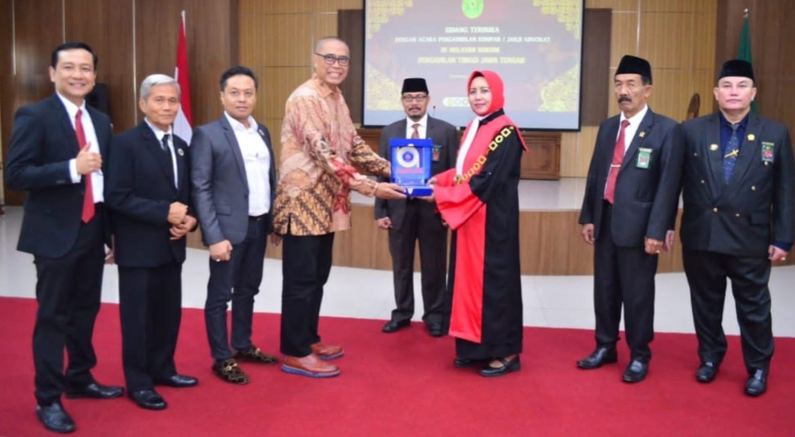 Penyerahan cenderamata usai sidang terbuka pengambilan sumpah 19 advokat baru. Momen ini menjadi simbol sinergi antara DePA-RI dan Pengadilan Tinggi Jawa Tengah.