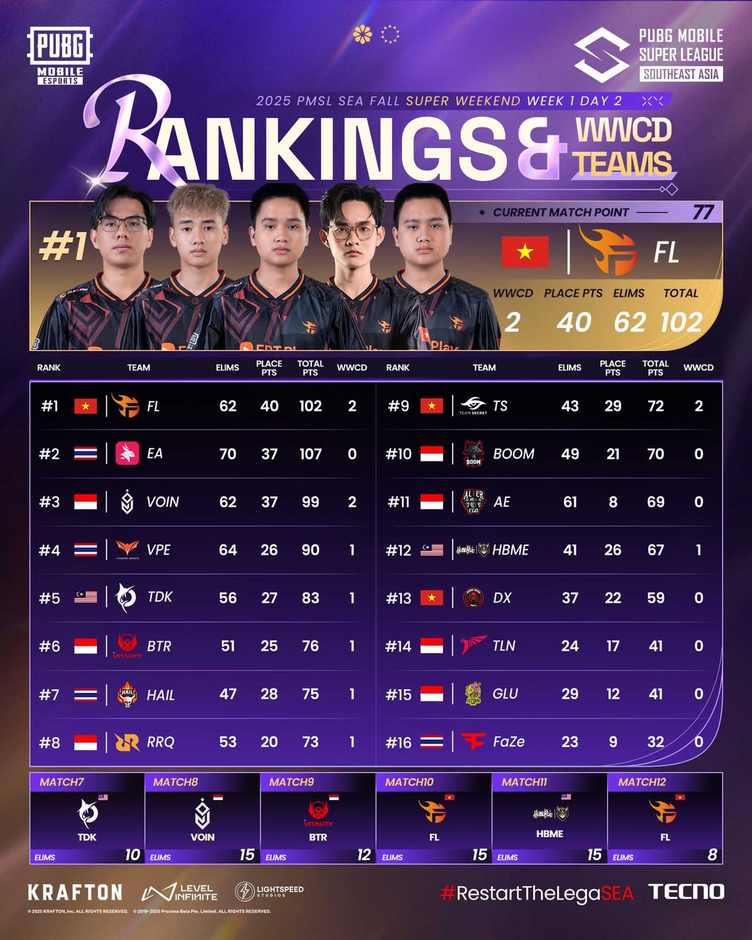 Team Flash dari Vietnam tampil konsisten dan berhasil menguasai klasemen. Mereka mencetak total 102 poin dan dua kali Winner Winner Chicken Dinner (WWCD), termasuk kemenangan penentu lewat Smash Rule di match ke-6. Hasil ini mengantar mereka ke puncak klasemen dan mengamankan 15 poin liga yang krusial.