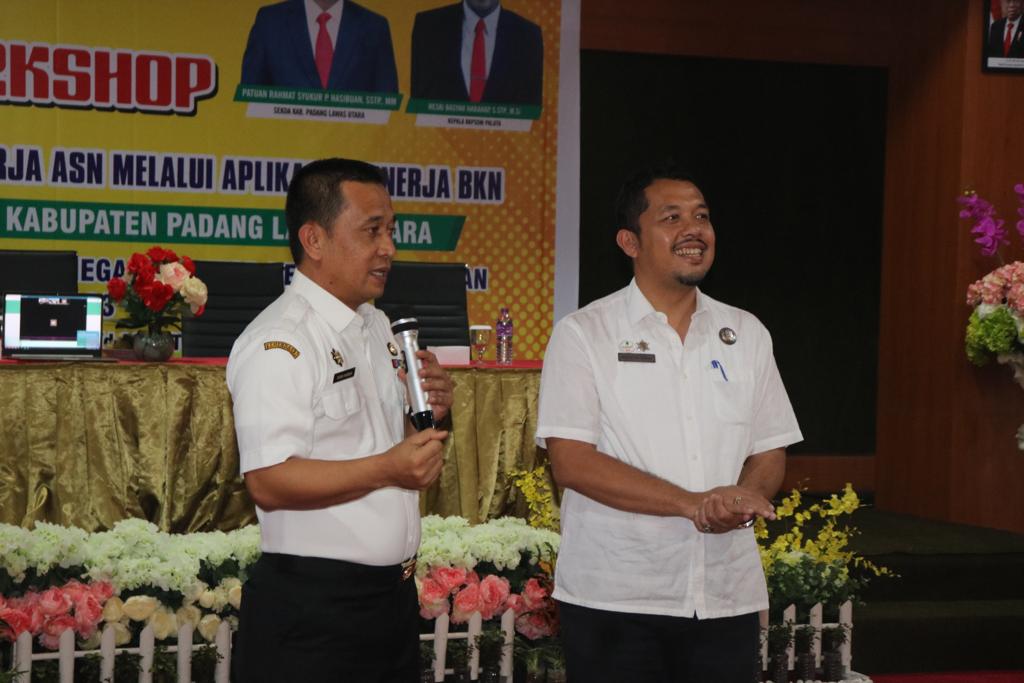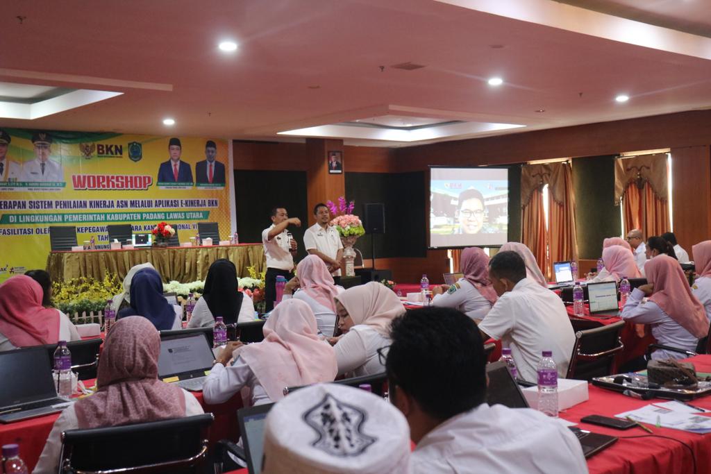 Workshop Penerapan Sistem Penilaian Kinerja ASN melalui Aplikasi E-Kinerja BKN di Lingkungan Pemerintah Kabupaten Padang Lawas Utara yang berlangsung di Aula Hotel Sapadia Gunungtua, Rabu (18/10/2023).